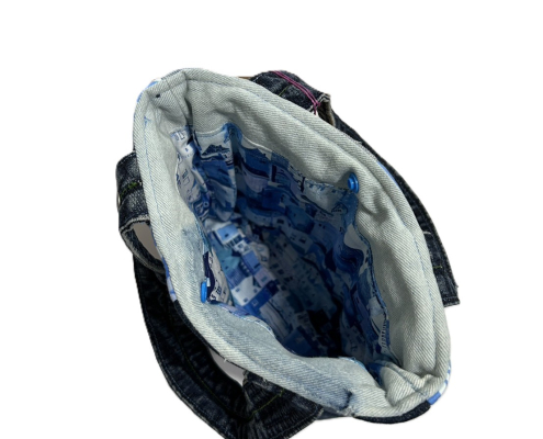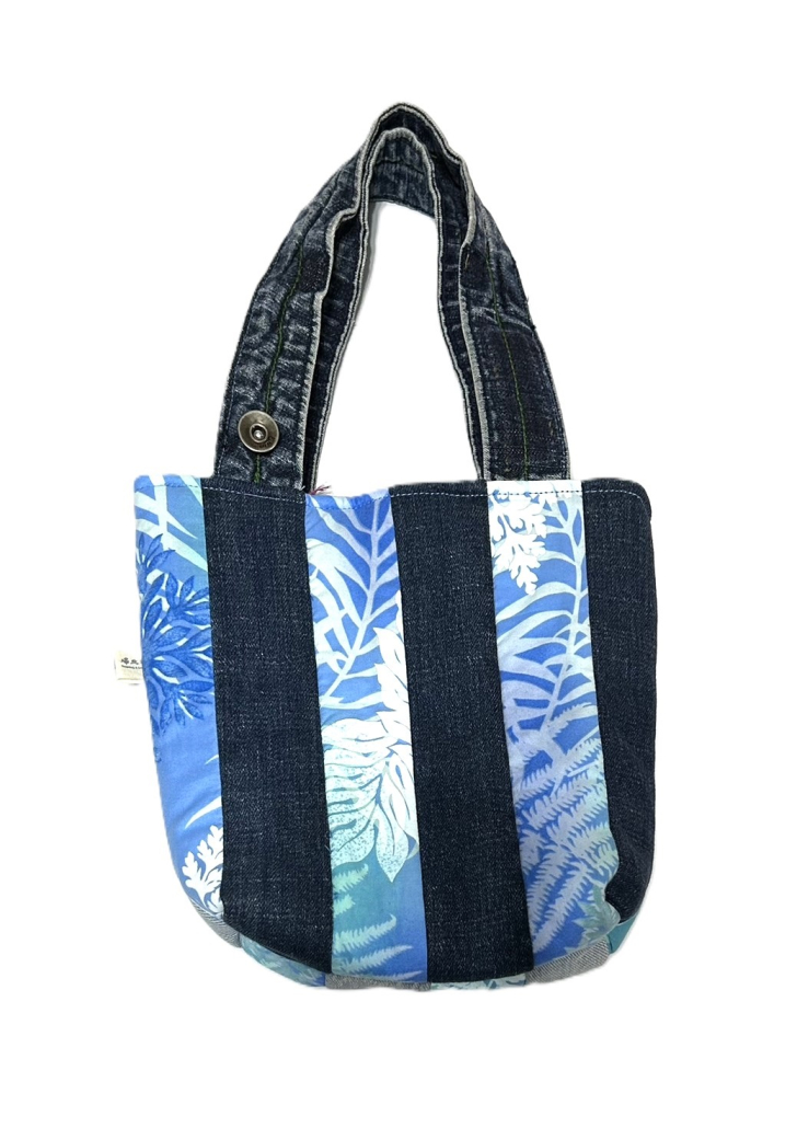 以回收丹寧布為基材,透過巧思手做工序,賦予丹寧布全新生命,製作成獨特風格的產品。因材料來源關係,每個包都是獨一無二的存在。內裡棉布為全新品。